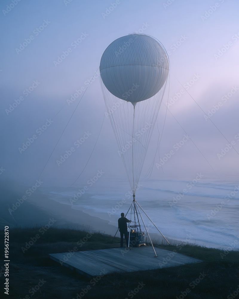 An observer stands near a tethered aerostat balloon on the coast #1956722870