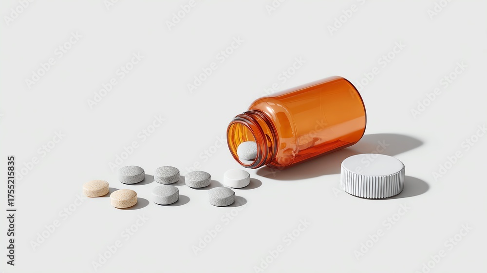 An orange prescription bottle spills various tablets on a white surface, showcasing the importance of medication and health awareness. Perfect for medical or wellness themes. #1755215835