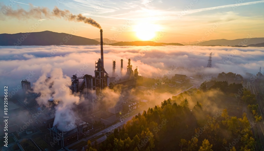 An orange sunrise glows over the river and lake as industrial factory chimneys release smoke into the morning sky, creating a silhouette of the city power plant amidst environmental smog #1892196682