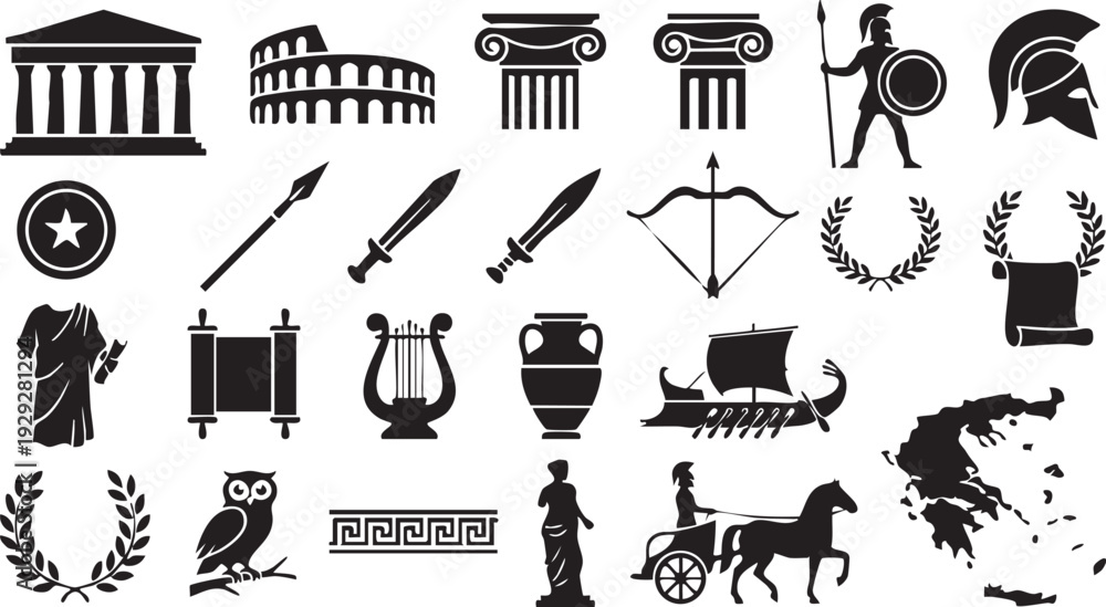 Ancient Greece civilization icons with parthenon temple columns spartan warriors and olympic laurel wreaths #1929281294