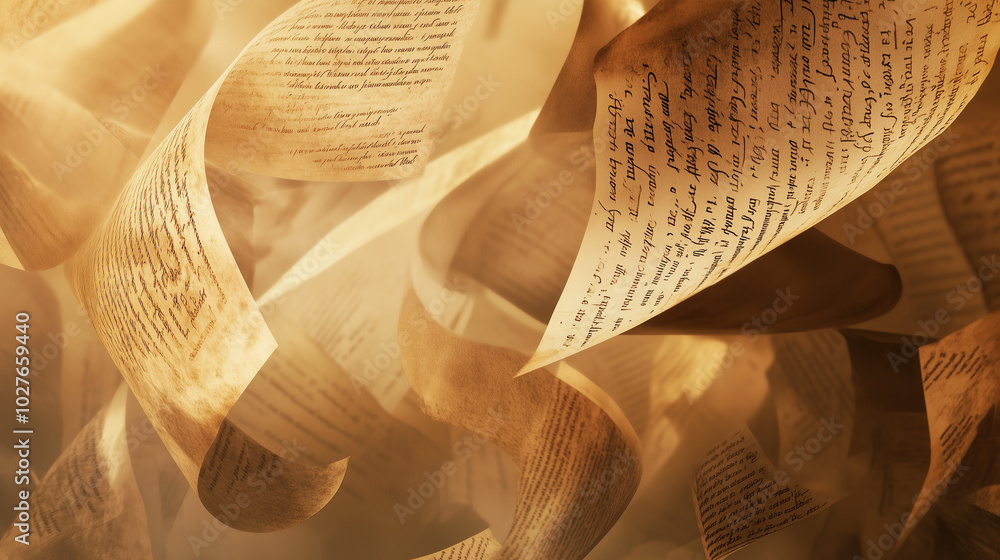 Ancient Manuscripts and Floating Text Papers in Artistic Motion #1027659440