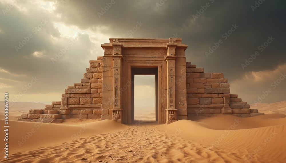 Ancient stone doorway in desert sand dunes. Crumbling ruins under hazy sky. Pathway leads to an opening in forgotten civilization architecture. Dry arid landscape. #1958867720