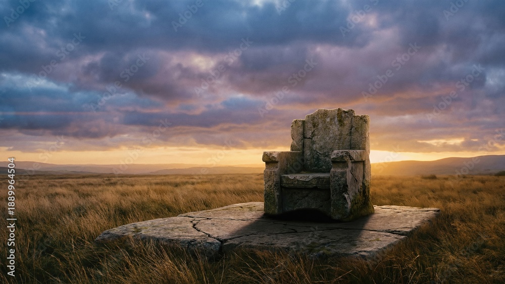 Ancient stone throne in a grassy field under a dramatic sky. Fantasy concept for historical epic or myth advertising. #1889964504
