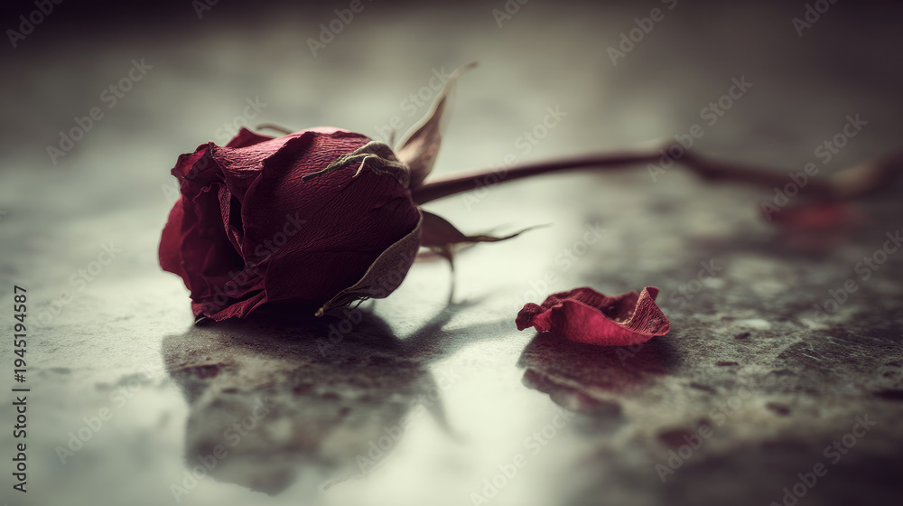 Anemia can cause pale skin and fatigue similar to faded beauty of wilted red rose lying on textured stone surface evoking sense of melancholy and loss #1945194587