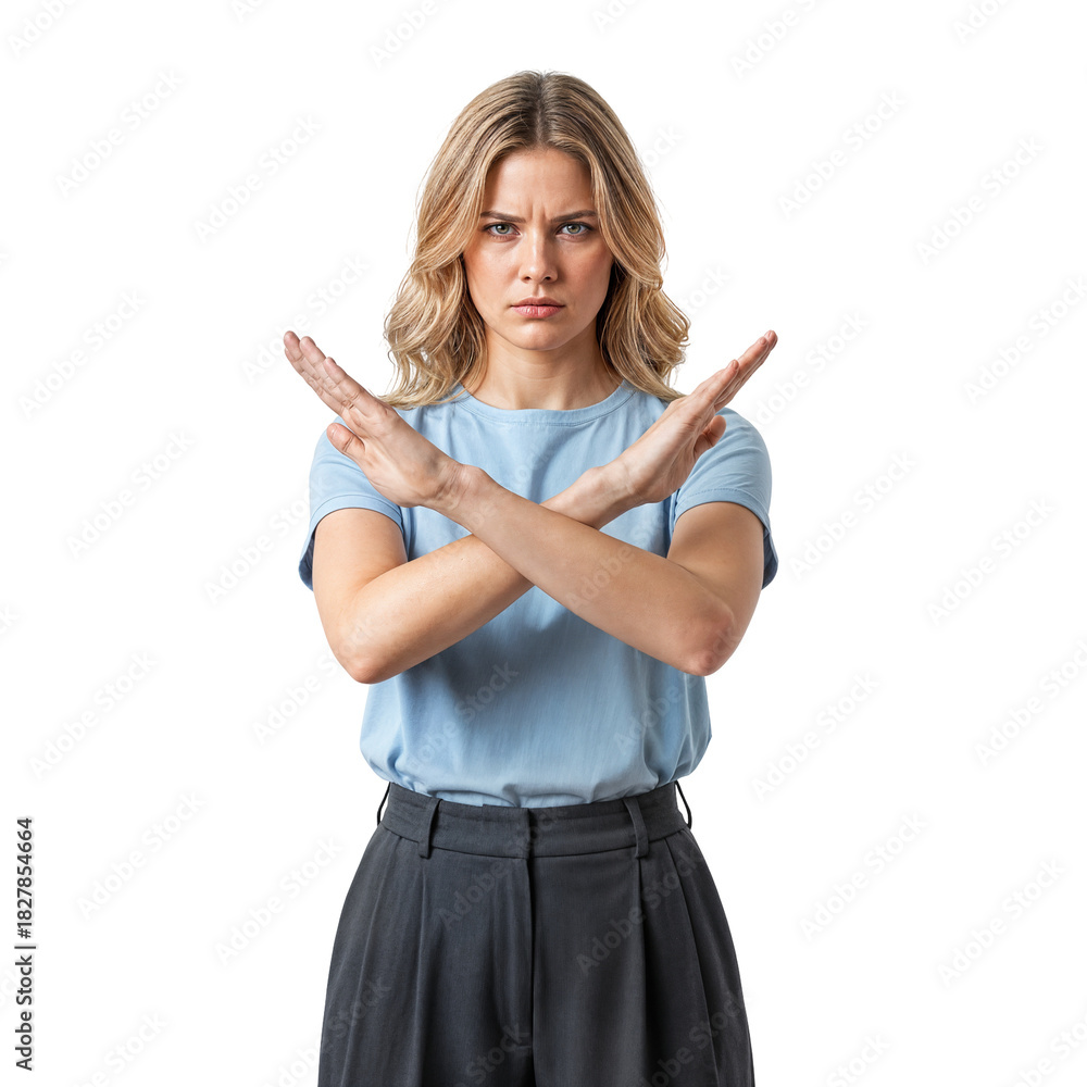 Angry beautiful young woman making an X gesture with crossed arms, showing refusal, prohibition, or disagreement on an isolated transparent background. #1827854664