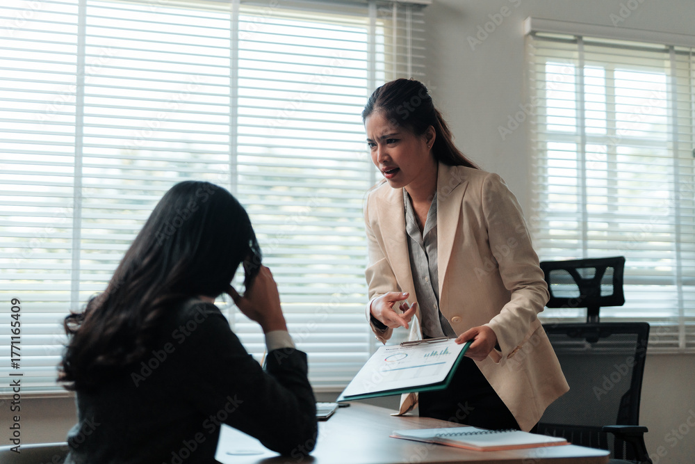 Angry female boss confronting a stressed employee, holding a document and discussing business problems in an office setting #1771165409