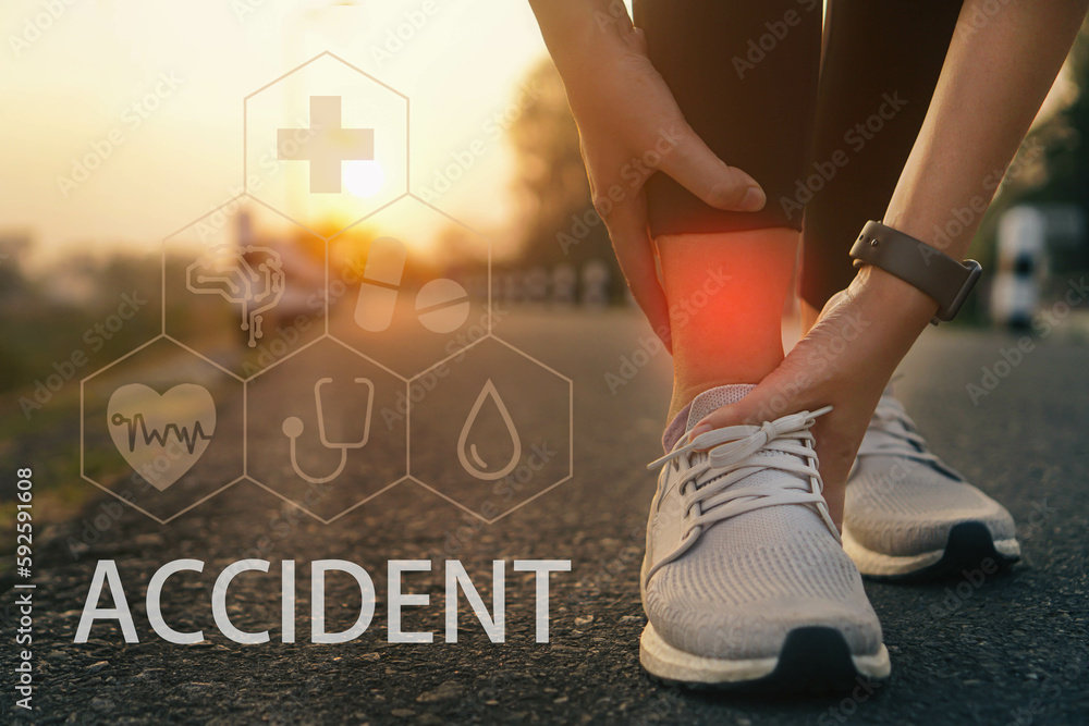 Ankle twist sprain accident in sport exercise running jogging.low key lighting. #592591608