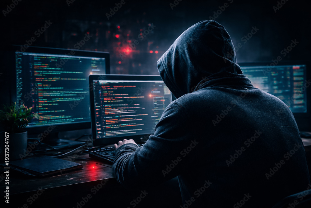 Anonymous hacker working at multiple computer monitors with programming code in dark office environment representing cybercrime cybersecurity threat #1937304767