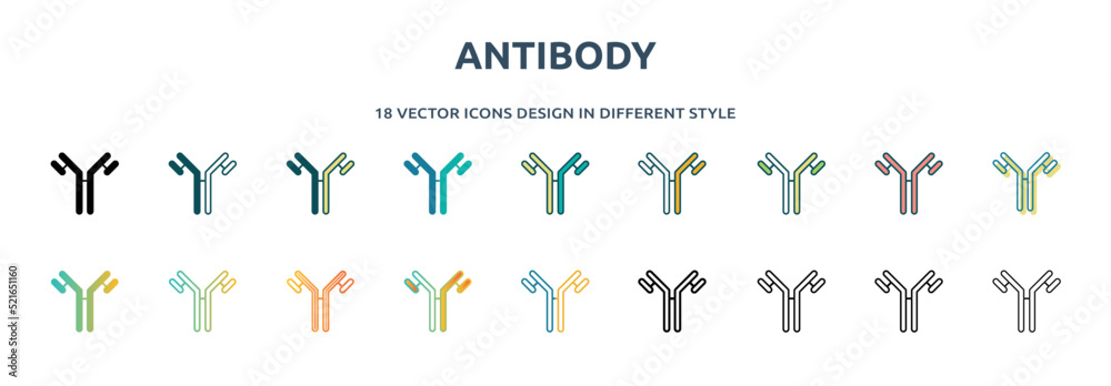 antibody icon in 18 different styles such as thin line, thick line, two color, glyph, colorful, lineal color, detailed, stroke and gradient. set of antibody vector for web, mobile, ui #521651160