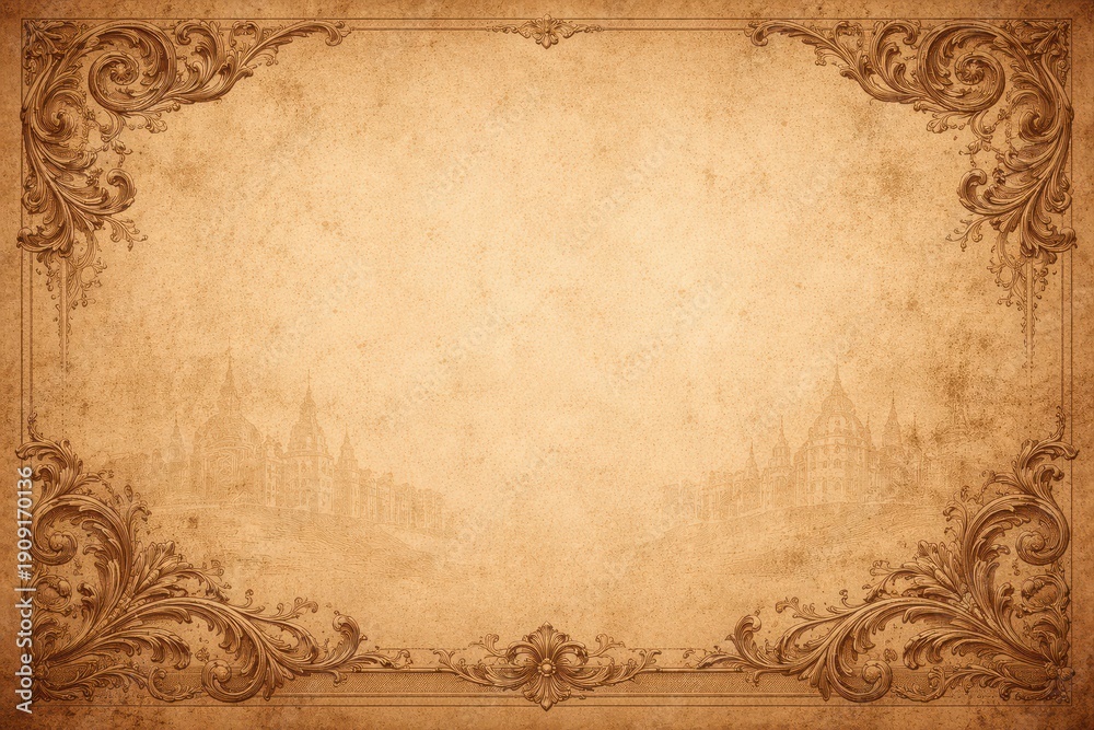 Antique paper with an ornate floral border and a faded vintage building sketch, creating a historical document background perfect for invitations and announcements. #1909170136