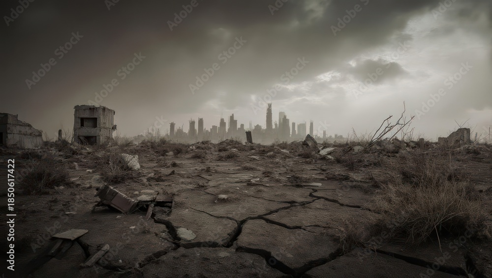 Apocalyptic Cityscape - Ruins and Desolation Under a Stormy Sky. #1850617422