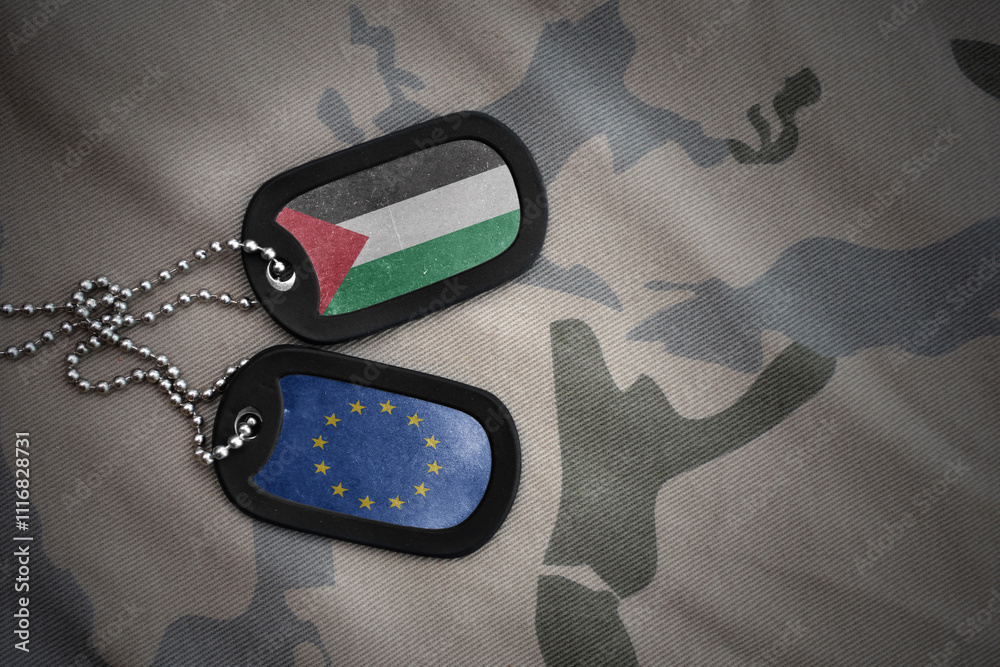 army blank, dog tag with national flag of palestine and european union on the khaki texture background. military concept. #1116828731