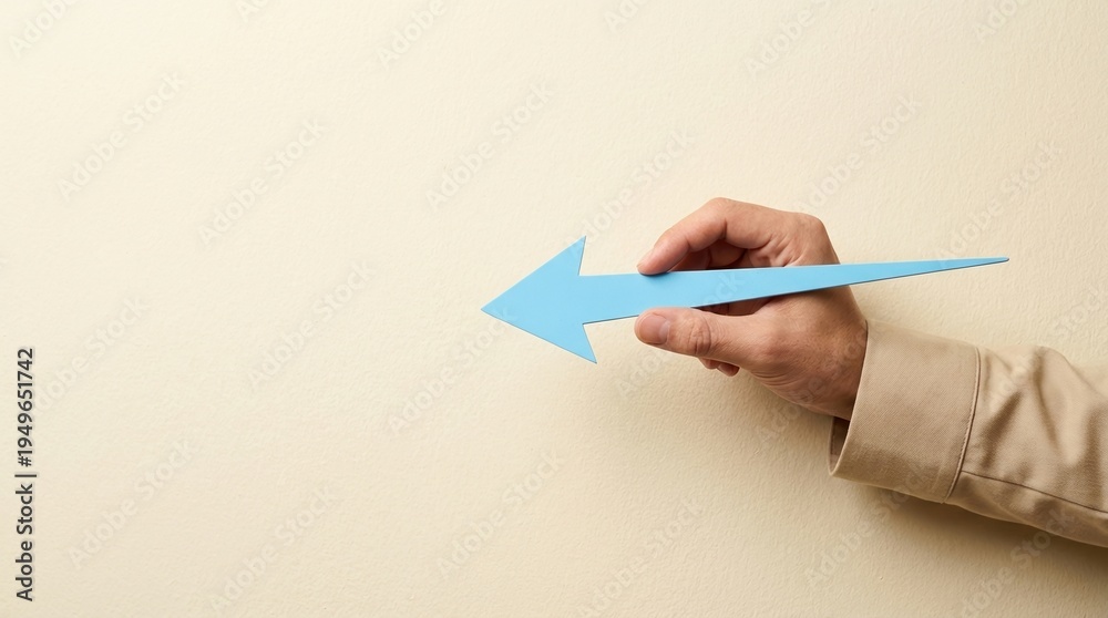 arrow blue hand point direction left business concept showing the way forward with a minimal blue arrow sign held by a male hand against a neutral beige wall copy space #1949651742