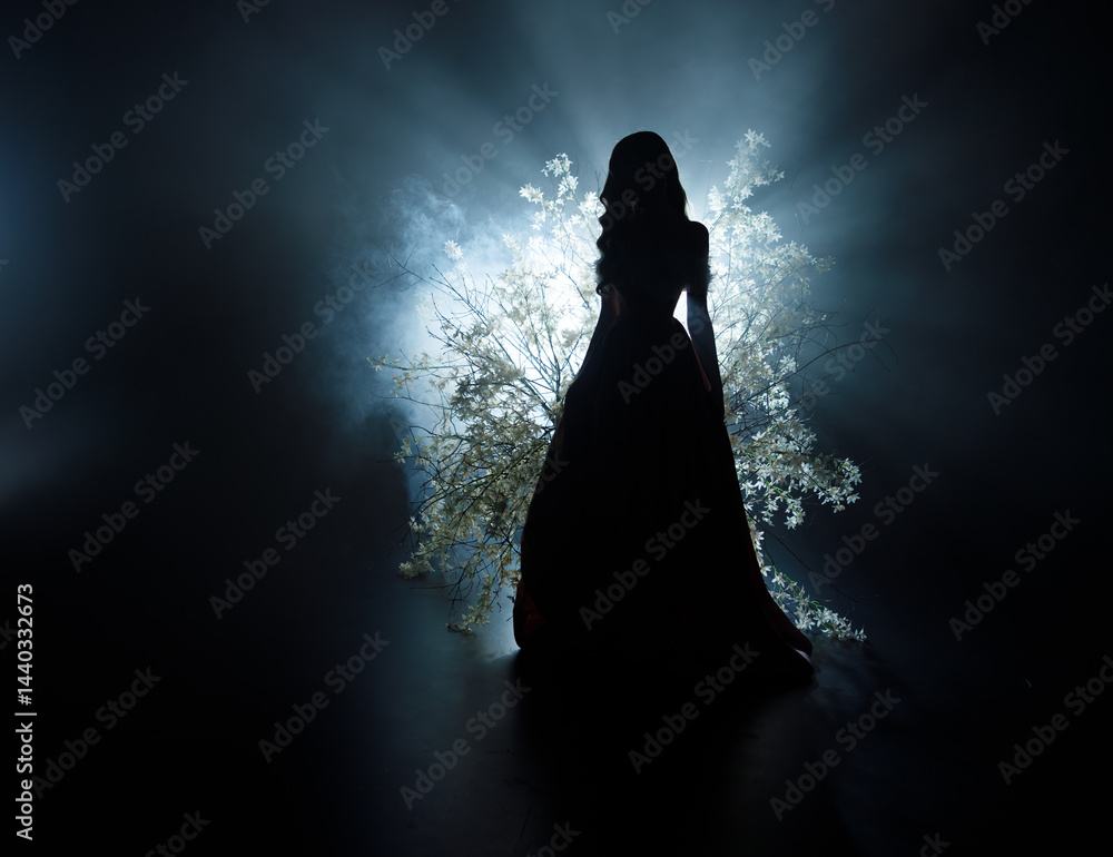 art photo real person fantasy girl princess black shadow silhouette walking in saint divine moon light ray in night dark spring forest fog tree white flowers tree. sexy goddess fairy elf woman ghost #1440332673