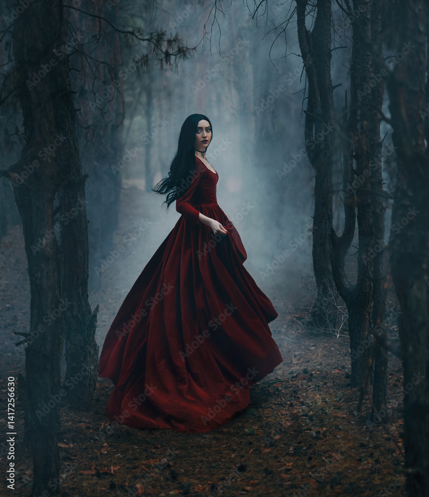Art photo real person Gothic girl walking running in dark foggy forest trees, red long medieval old style long dress flies in wind, train fluttering in motion. Fantasy Woman Black hair beautiful face #1417256630
