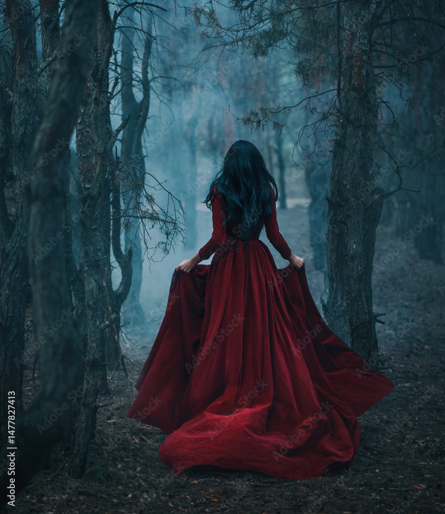 Art photo real person Gothic girl walking running in dark foggy forest trees, velvet red long medieval old style long dress train fly wind. Fantasy Woman Black hair back rear view fairy princess #1477827413