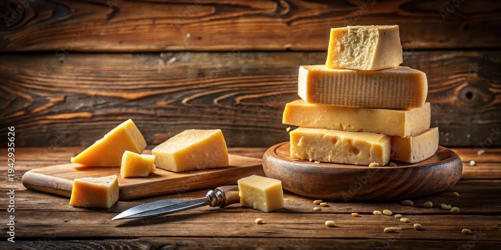 Artisan Cheese Selection on Rustic Wooden Board with Cheese Knife #1942935626