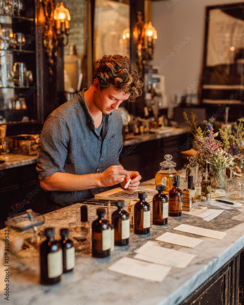 Artisan Perfumer Testing Scent Strip with Glass Bottles and Paper Labels in Elegant Studio #1963989523