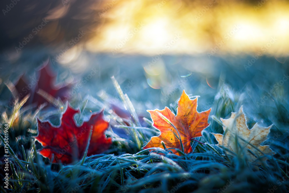 Artistic autumn landscape with bright multi-colored maple leaves lying on the grass covered with blue shiny crystals of hoarfrost on a frosty morning in the park #1755011968
