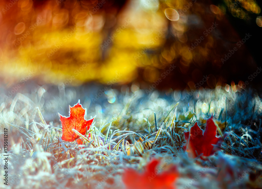 Artistic bright autumn landscape with red maple leaves lying on the grass covered with blue shiny crystals of hoarfrost on a frosty morning in the park #1755012117