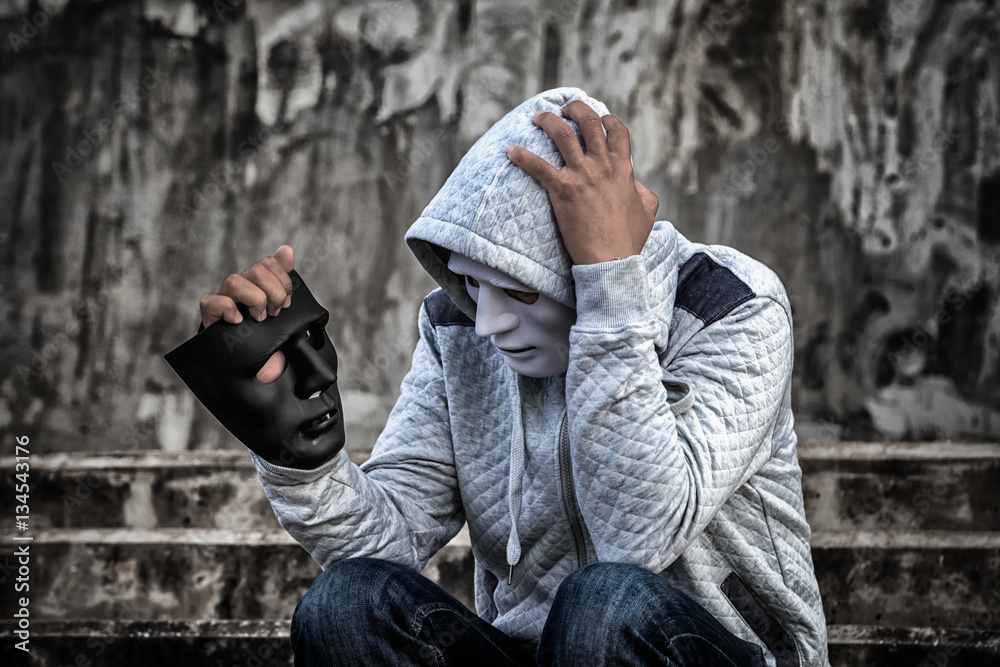 Asian man in the hood and white mask with confused depression sitting on stairs and looking at black mask, in scary abandoned building, Human face expression, Good and Bad temptation concept. #134543176
