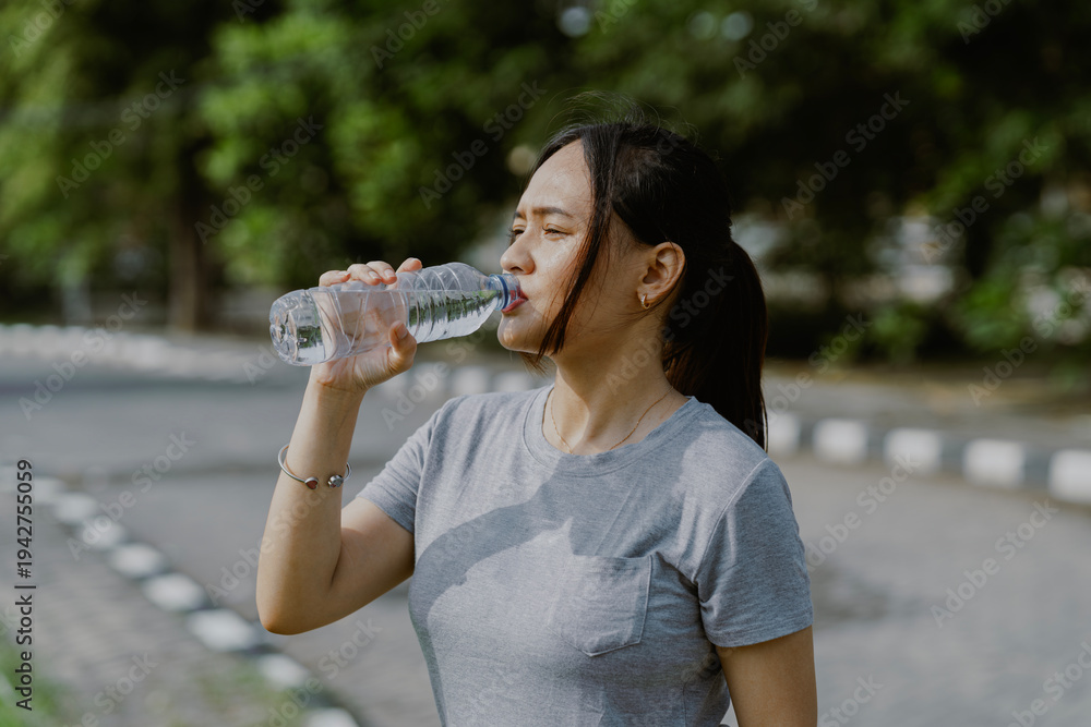 • #1942755059 Asian sportswoman making break in jogging, drinking water on bottle in the park. Copy space for text.