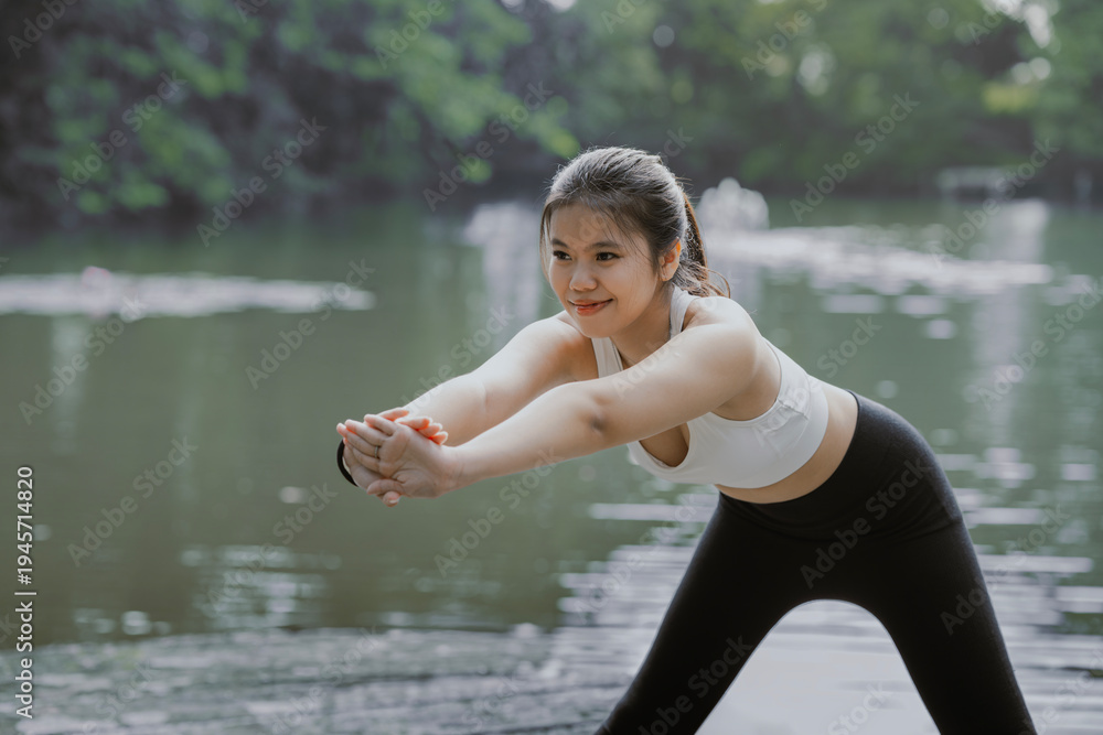 Asian sportswoman warming up outdoors. Fitness young female doing stretch exercise stretching her arms. #1945714820