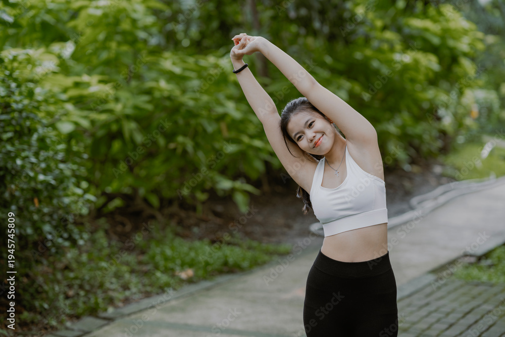 Asian sportswoman warming up outdoors. Fitness young female doing stretch exercise stretching her arms. #1945745809
