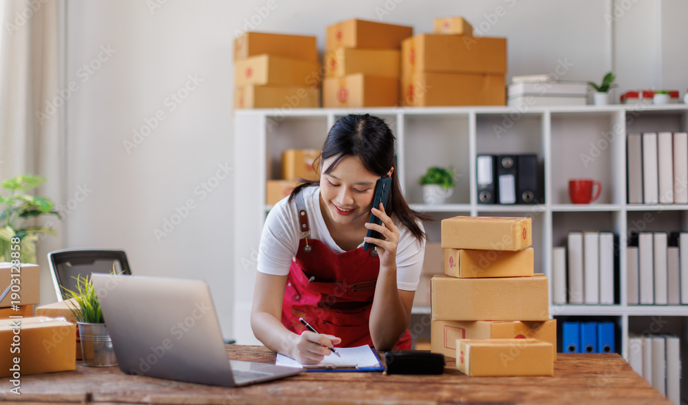 Asian woman small businesses SME owners asian female entrepreneurs call phone on receipt box and check online orders to prepare to pack the boxes, sell to customers, SME business ideas online. #1903128858