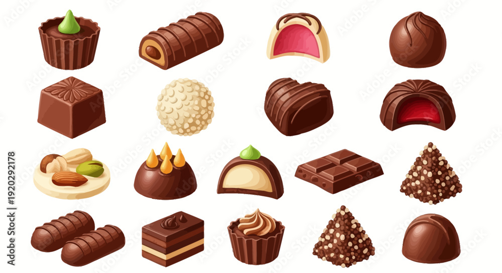 Assorted chocolate candies and sweets displayed on a clean white background from a direct top-down viewpoint #1920292178