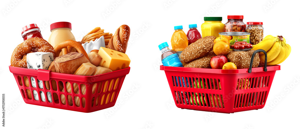 Assorted Groceries and Snacks in a Red Shopping Basket isolated on a transparent background #1752958555
