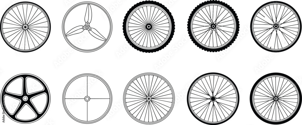 Assortment of Bicycle Wheels and Spokes in Black and White Line Art bike #1847113320