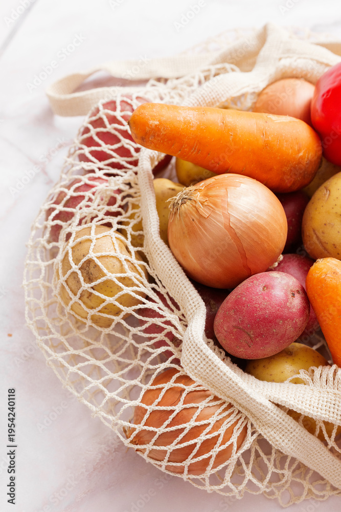Assortment of fresh produce featuring red potatoes carrots and onions in a woven mesh grocery bag #1954240118