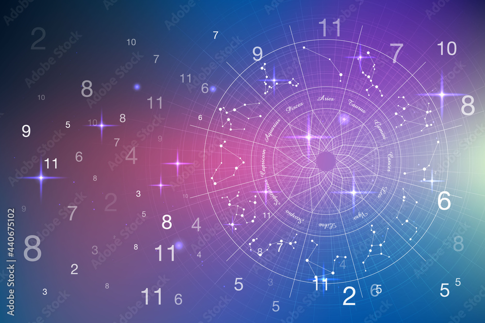 Astrology and numerology concept with zodiac signs and numbers over starry sky #440675102