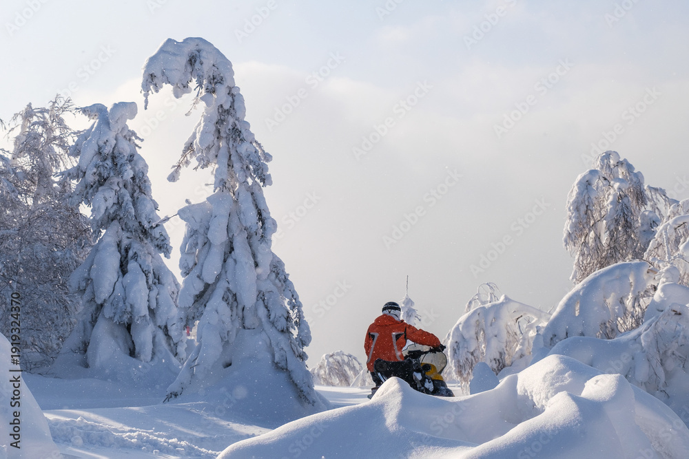 Athlete on a snowmobile moving in the winter forest in the mountains of the Southern Urals #1919324370