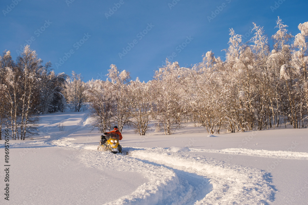 Athlete on a snowmobile moving in the winter forest in the mountains of the Southern Urals #1969576764