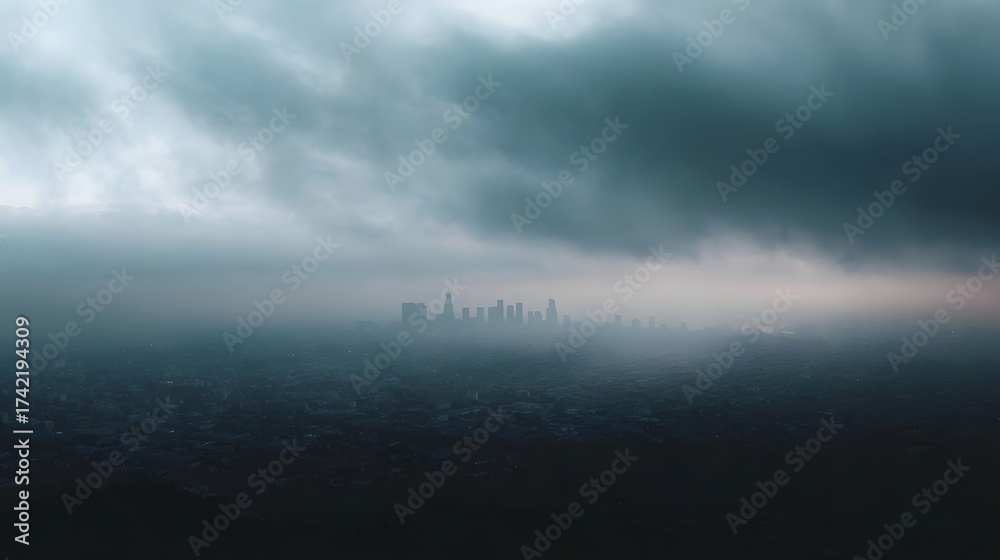 Atmospheric urban skyline shrouded in dense fog and smog under a dramatic overcast sky creating a moody and obscured cityscape view #1742194309