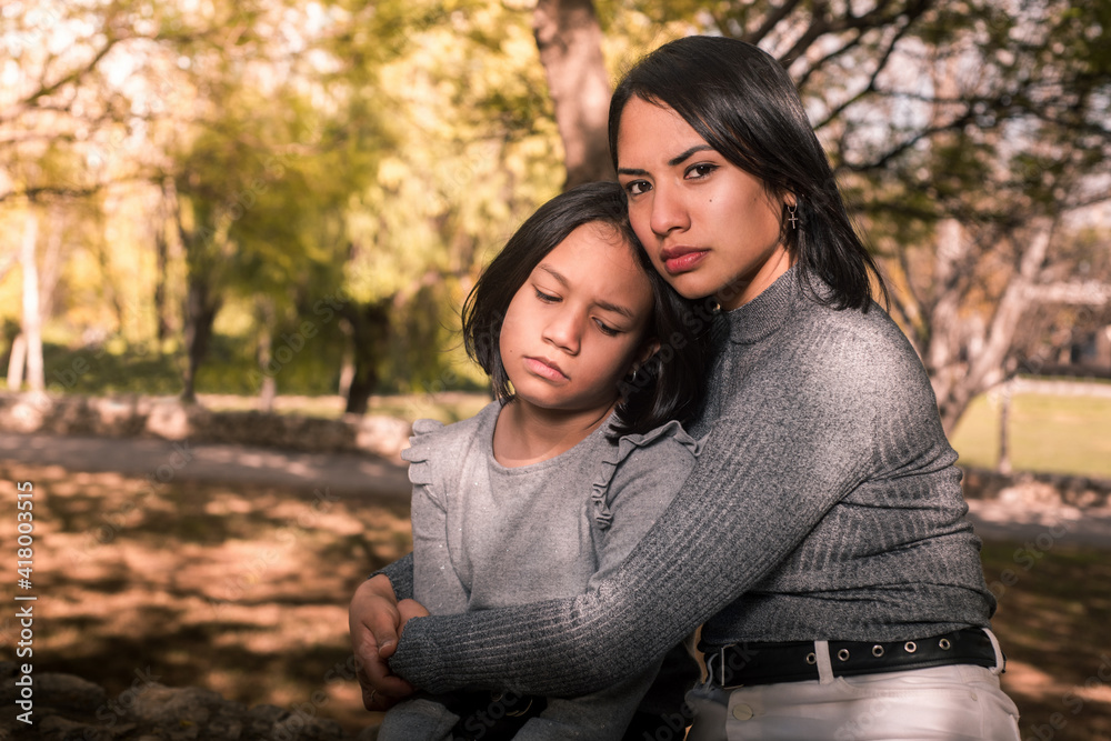Attractive serious woman embrace her daughter and look to the camera outside. Concept of maternal protection of a single mother. #418003515