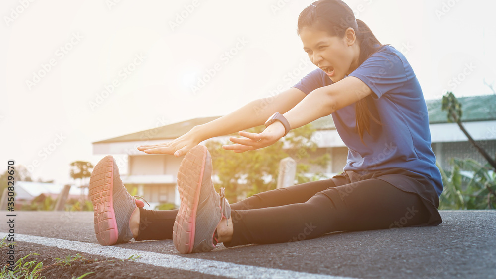 attractive sportsmen girl stretching in the park before running at the sunset focus on shoes.Exercise concept. sport lifestyle. #350829670