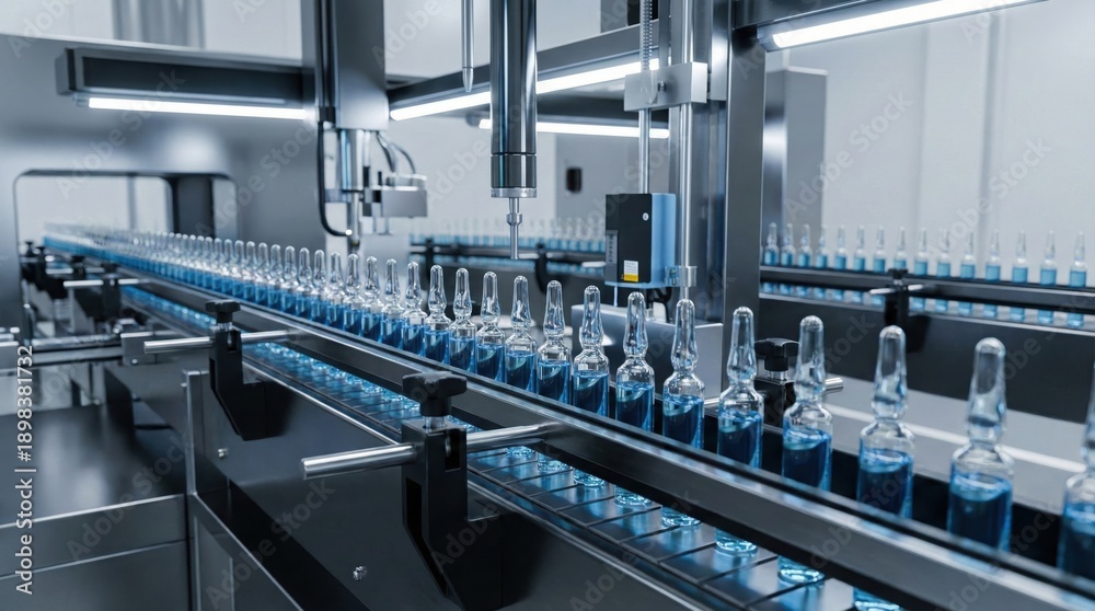 Automated pharmaceutical production line filling glass ampoules with blue liquid,high-tech sterile factory process for medical manufacturing #1898381732
