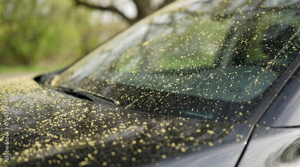 Automobile covered in a thick layer of yellow seasonal pollen, a common allergen, during springtime #1943624189