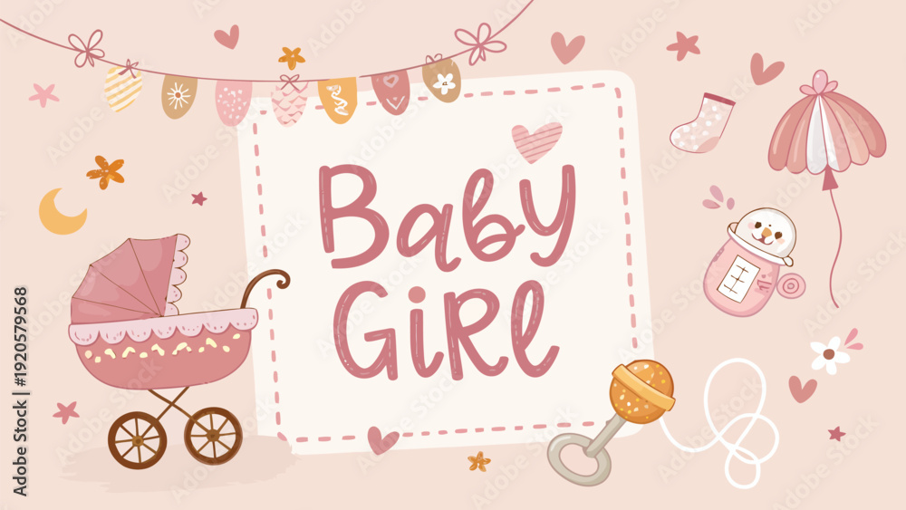 Baby girl arrival greeting design soft pink background with stroller toys and accessories #1920579568