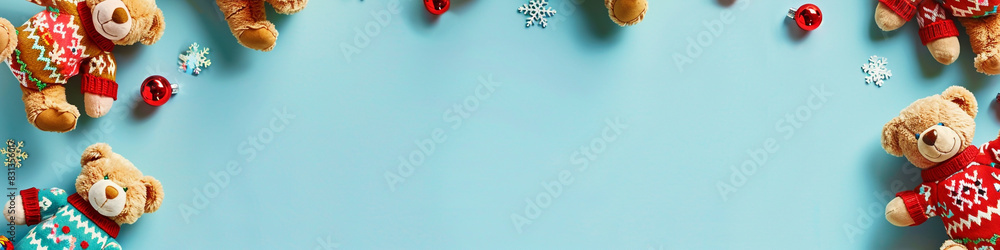 Baby kids toy frame background featuring a mix of cuddly ginger and apricot teddy bears, each in colorful Christmas sweaters decorated #831356017