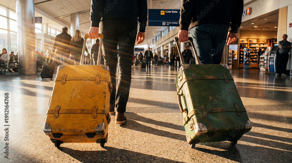 Back view of travelers walking with vintage suitcases through airport terminal at sunset. Passengers pulling luggage on wheels during departure or arrival. Travel, tourism and vacation concept. #1912164768