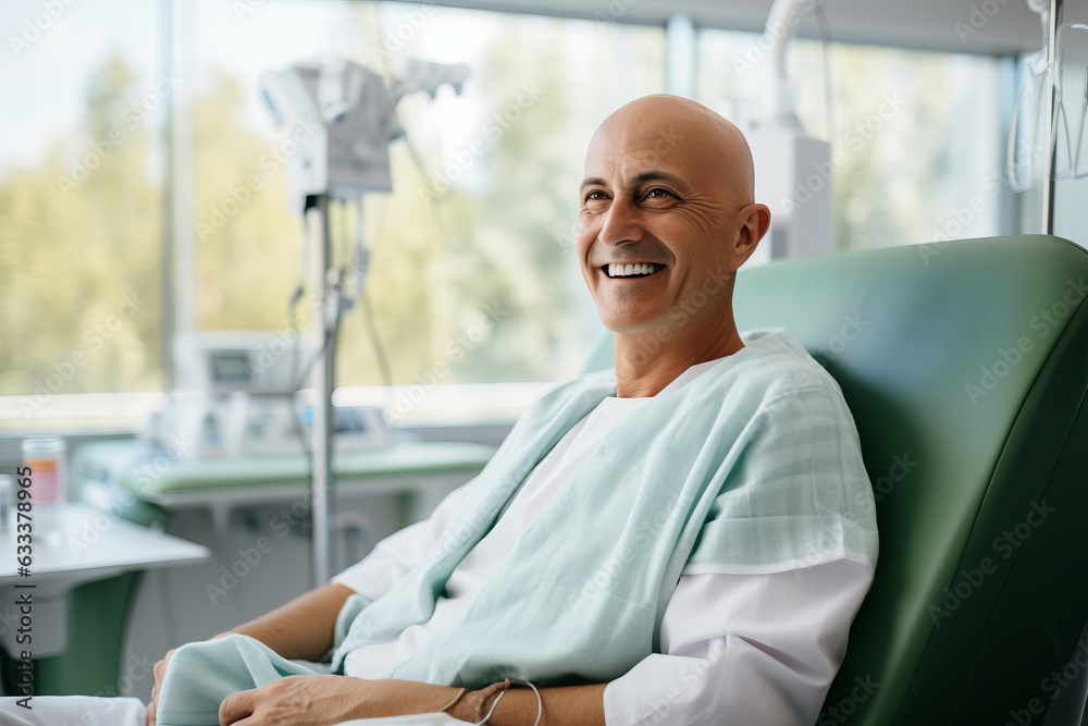 Bald mature man smiling in cancer hospital bed . #633378965