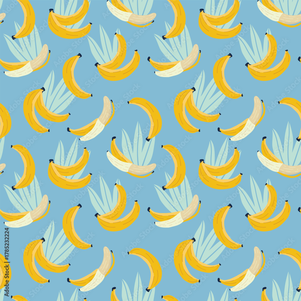 Banana seamless pattern. Blue background with tropical illustrations of bananas and leaves. Flat vector illustration. #1785232224