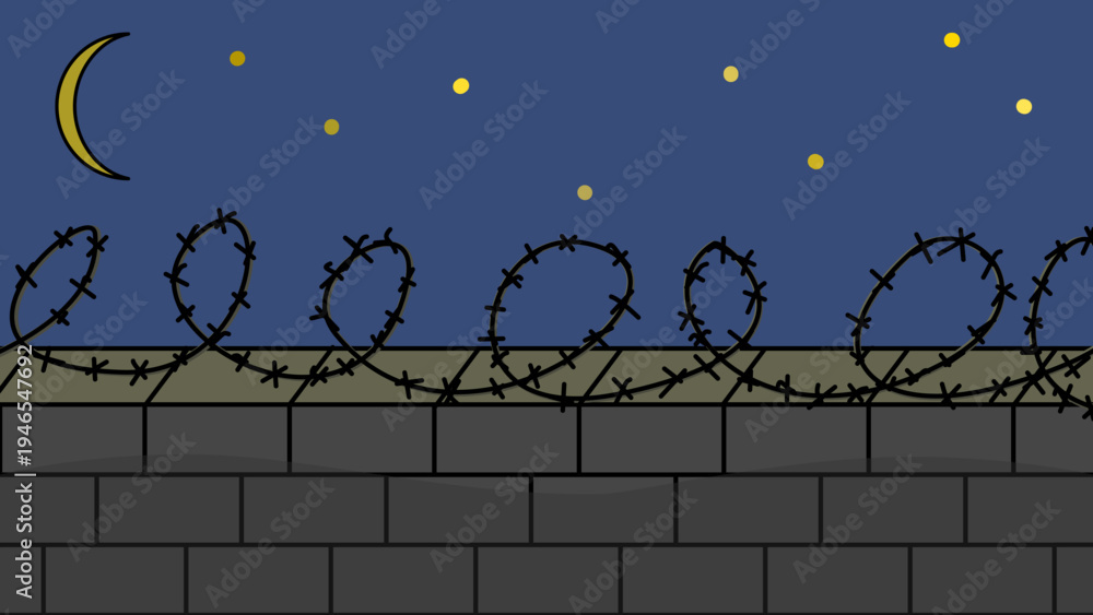 Barbed Wire Fence on a Stone Wall under a Starry Night Sky with Crescent Moon #1946547692