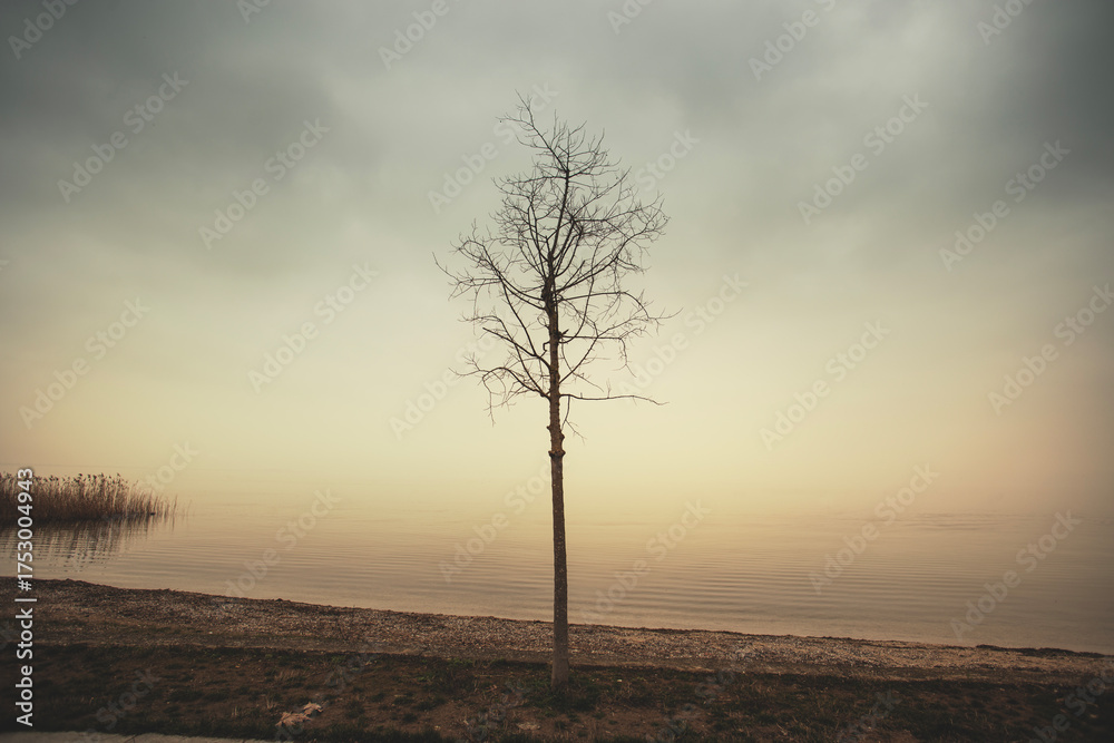 Bare tree in front of a lake at sunset, backlit during the autumn season #1753004943