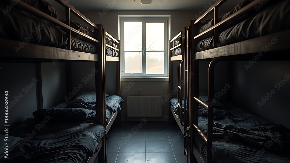 barracks. Military-style bunk beds with neat blankets in morning light. real-estate listings, architecture portfolios, designed for real-estate listing and luxury residence showcases. #1844438934
