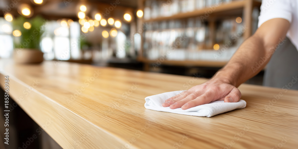 Bartender wiping wooden bar counter, cleaning service preparing for opening, ensuring hygiene for customers #1855163984